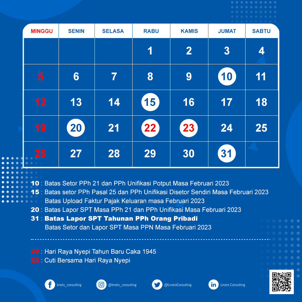 Kalender pajak Bulan Maret 2023, sebagai informasi dan pengingat bagi wajib pajak dalam pemenuhan kewajiban perpajakan. Jangan lupa untuk Lapor SPT Tahunan Orang Pribadi batas waktu 31 Maret 2023.